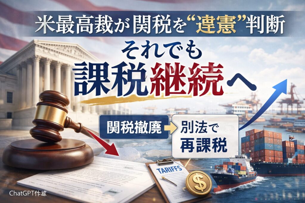 2026年2月、アメリカの関税政策をめぐり大きな転換点となる判決が下されました。米連邦最高裁判所は、トランプ前大統領が「国際緊急経済権限法(IEEPA)」を根拠に発動した包括的な関税措置について、議会の明確な承認を経ていないとして違法との判断を示しました。しかし注目すべきは、その直後に政権側が“別の法解釈”を用いて新たな関税措置を打ち出したことです。違憲とされたにもかかわらず、関税政策は形を変えて継続する構図となっています。